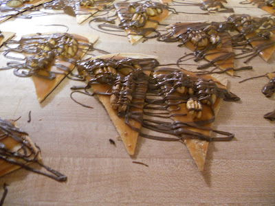 When tortillas are done, spread your caramel on each triangle and stick 1-your desire of pecan halves on right away so they stick. When you have completed this process with all, melt your chocolate and drizzle on top. Enjoy!!!!!!!! Not too bad, and I guarantee you will have people begging you to make them again!