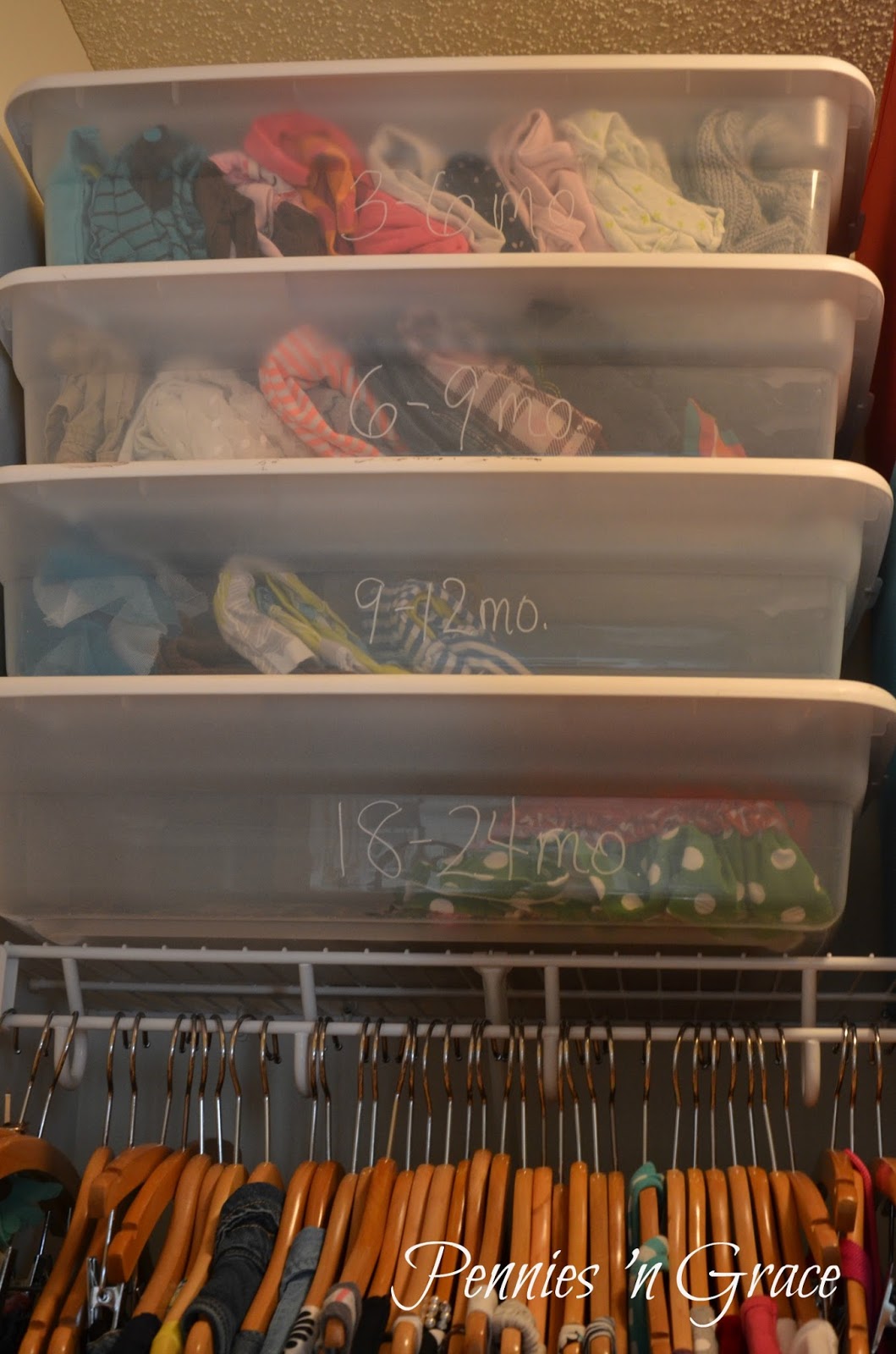 • Hanging Clothes: Clothes are hung by order of child’s age. Maddie’s are on the left, Ella’s are in the middle, and baby girl’s are to the right. When your child knows where their hanging clothes belong, you can teach them to hang their own laundry essentially taking a minor task off of you!