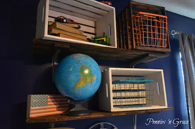 We then made 2 pallet shelves above the desk, spray painted several wire baskets, stained an old crate, and gathered a few pieces of decor to fit in his new spot.
