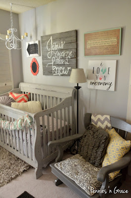 I’ve been working on our little one’s “room” or better known as a corner for several months. I’ve made some pallet creations, sanded and painted an old crib, found cute accent pieces, spray painted fun finds and more. It’s been an enjoyable project that hasn’t happened overnight and has NOT broken the bank. And, to be quite honest I’ve spent less than $30 total for the whole corner!