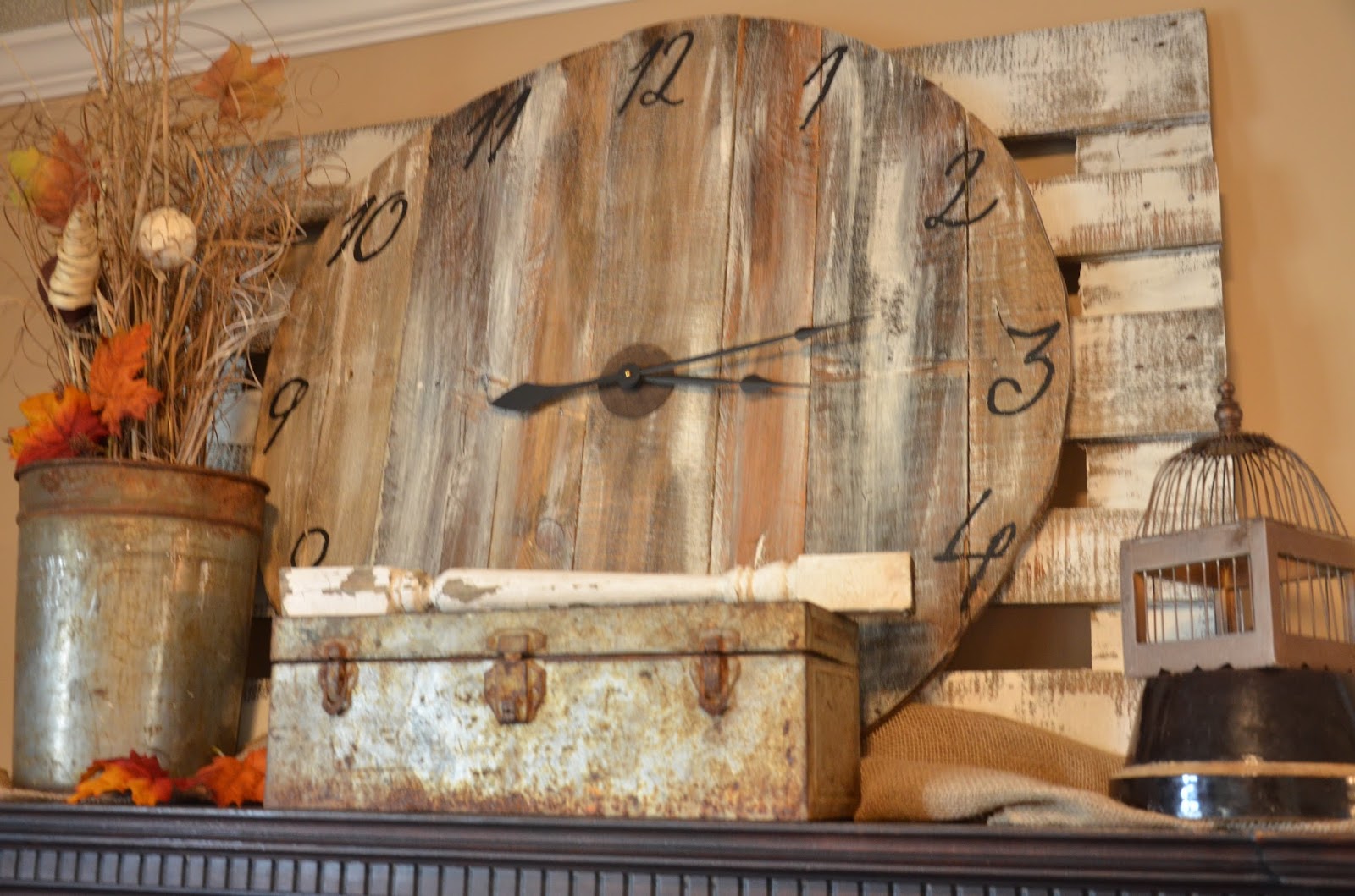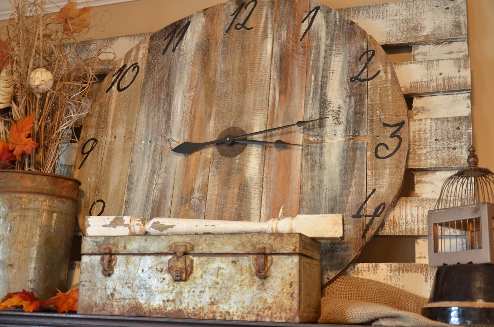 The old toolbox, rusty bucket of fall foliage, and the rusty bird cage complete my fun new creation.