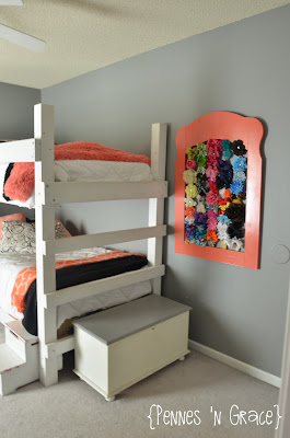 My handy sander took the wording off quite easily. I then gave it a bit of a coral wash and added small nails to the top and bottom in order to hang all the darling headbands.