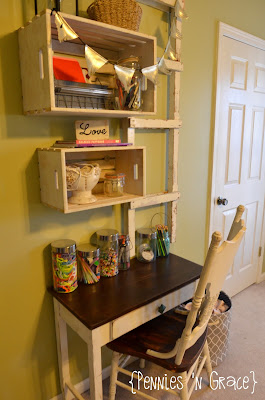 So, my sweet girl and I set out on a mission. We “shopped” the house and found some cute crates to use as shelves…then we went to work!