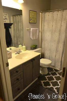Sometimes a little splash of paint makes a huge difference! We have these cheap looking white cabinets in the upstairs bathroom. Quite honestly, they were annoying to clean. I’d try to scrub them down every week, but they never seemed to come clean. A few weeks ago I decided to grab some gray chalk paint and a gray stain to give it a little bit of a washed gray look.