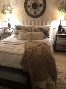 It’s been several weeks since I posted about my exciting bedroom change. Our schedules have been crazy busy, but I finally carved out enough time to put together a simple headboard for our bedroom. A friend of mine brought me several old fence pickets awhile back, and I wasn’t sure what I’d use them for, but I knew they wouldn’t sit around too long. I didn’t love the headboard we had before, so I did not want to waste my time fixing it. My plan was to just space the pickets on some cheap wood I had in my stock and just put it in place to see if I liked it. I loved it once I had it together and couldn’t wait to see it against the faux brick wall.