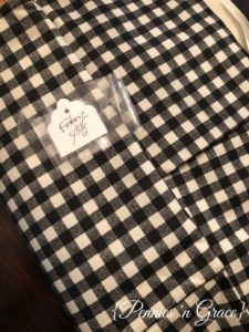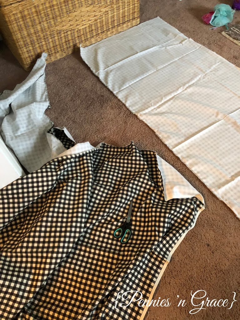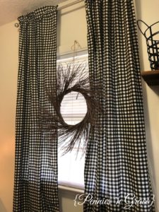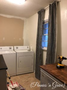 Painting the laundry room made a HUGE difference in the look of the room, but I knew I wanted to change the curtains too. When we moved in, I just hung an extra two panels that I had stored in my decoration pile. I loved them, but I was really wanting to get away from the brown colors if at all possible. Black and white buffalo check has become pretty popular lately, and I really did like it. It’s not a print I want everywhere, but a little pop in some curtains sounded fun. When I priced that print of fabric at several stores, I quickly discovered that it would not be a wise move with the amount of money I desired to spend on this project. So, it sort of got moved to the back burner, and I started thinking of other options even though they weren’t my first choice.