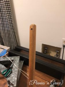 I drilled holes in the items that didn’t have one in them and then used a skinny rope in order to tie to each one and hang on a cute little hook that I purchased at Hobby Lobby on 50% off.
