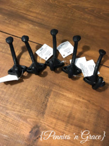 Notice that hole in the wall and piping? Oh, and the fact that the much needed outlet in the room is right next to it? 😣It’s just another sore spot in the room, but I will show you what I put in front of it to hide it most of the time. I found five cute hooks at Hobby Lobby for $1.50 each and snatched a piece of wood from my stash and set to work.