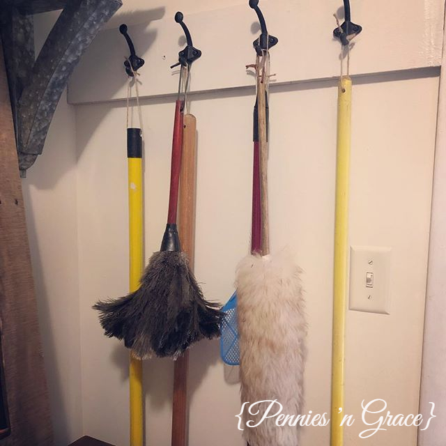 Our brooms, mops, and other such cleaning paraphernalia always got shoved behind the door. It was annoying and created so many dust bunnies on the floor that I couldn’t stand it anymore. When I was cleaning out the room and making a list of projects I knew I needed to organize this minor mess.