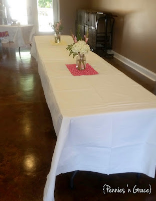 I just threw a white cloth on each table, put a colorful place setting down, and made a few pretty flower centerpieces in a ball jar on top of a scrap of pink or yellow fabric. It was a fairly simple task, but truly a fun evening with our sweet ladies at church.