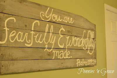 Sometimes, when you rearrange a little in a room it leads to a big empty space needing something large to fill the void. My pallet supply came in handy again when I didn’t want to spend a cent on this task. I let my oldest pick what she wanted to write and the color of paint. I also let her help me paint the words on. It isn’t perfect, but it makes me smile knowing we did it together. The memory alone was worth it all! And, now every morning she can wake up and be reminded that she truly is fearfully and wonderfully made!