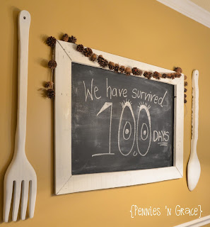 I used white chalk paint for the paint. It took two good coats and make them pop off my weird colored kitchen walls. That is probably on the agenda to change this year. And, don’t you love my happy survival note on my chalkboard? Homeschooling with 5 little ones can be daunting some days, but we were excited to celebrate our 100 day mark!!! Summer is coming!
