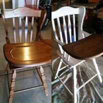 Since our little miss is now using this highchair, I decided it was time to finish painting, distressing, staining, and sealing with some clear coat.