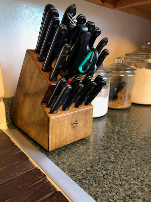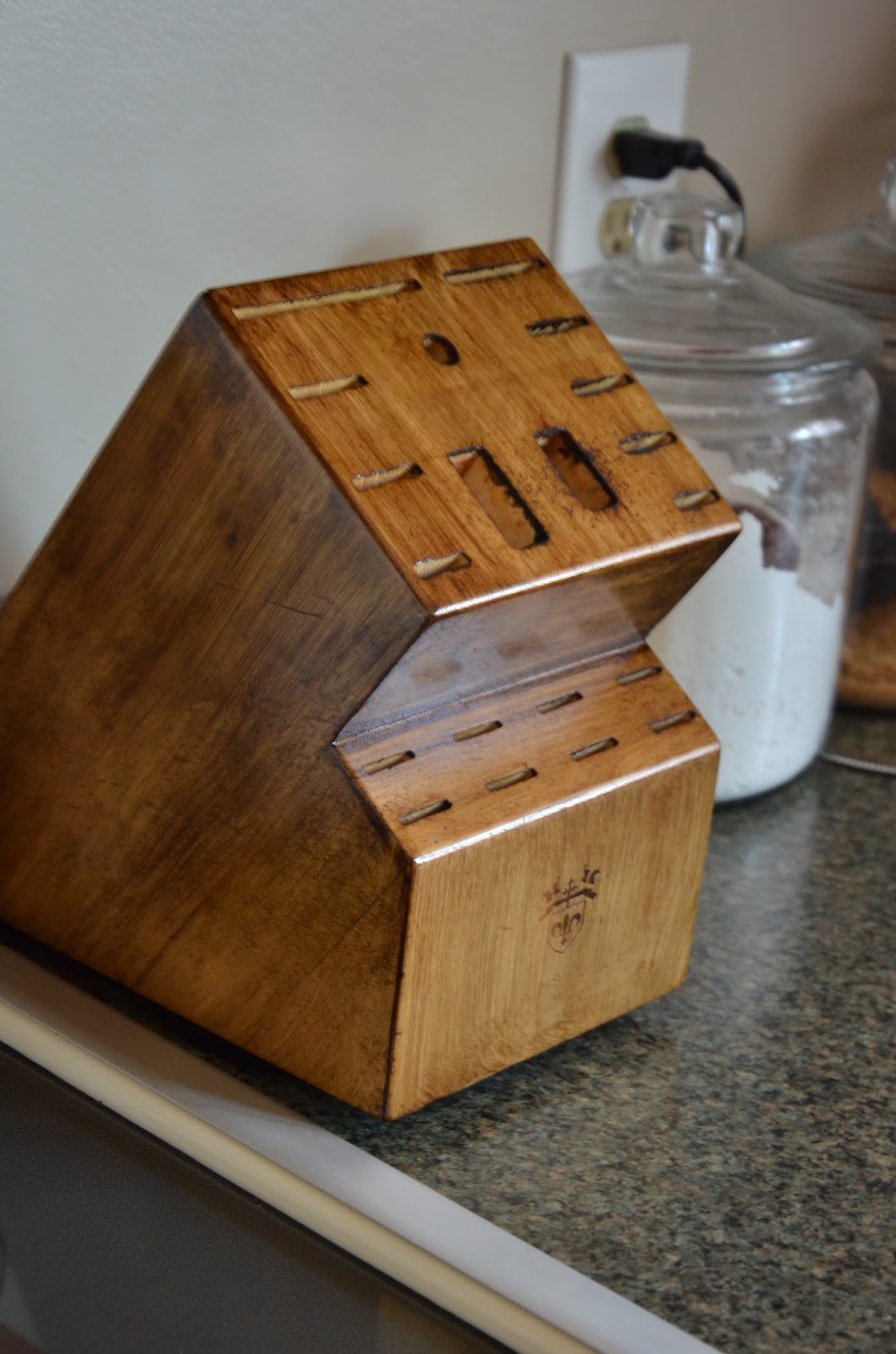 My knife block is pushing 13 years old, and it is one of those eyesores. So, I experimented this week and rough sanded it and wiped some dark walnut stain to give it a bit of a makeover. I probably will sand again and put another coat of stain on it, but for now it isn’t as hideous. 😉