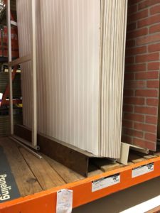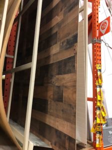 I really liked this pallet wood looking panel in the above left picture, but was really hoping for a brighter look in our room. And, the beadboard look is always amazing, but I wanted something slightly different. Plus, I plan to use beadboard (my friend and I found in a construction sites’ dumpster) as my backsplash in the kitchen.