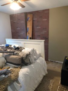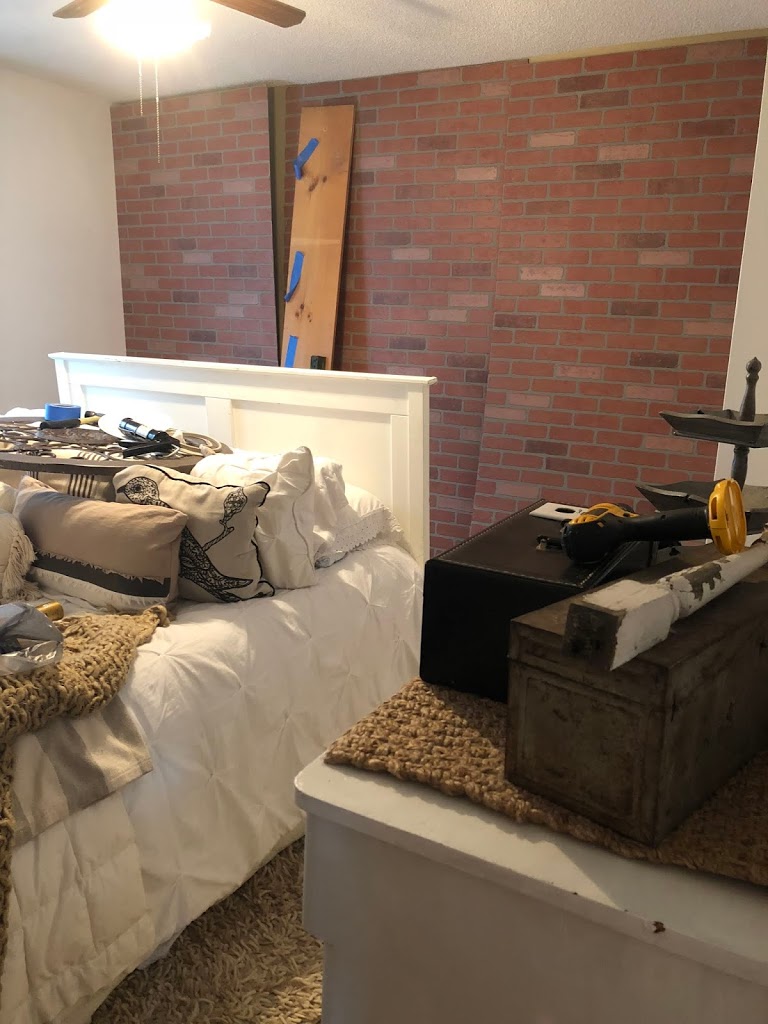 When I was brainstorming on what to do with our room, I knew I wanted to do something with the wall directly behind our bed. I actually hit pinterest for a few ideas and then walked through the aisles of Home Depot for a bit of inspiration. I contemplated a pallet wood wall or ship lap, but wasn’t sold on either idea 100%.