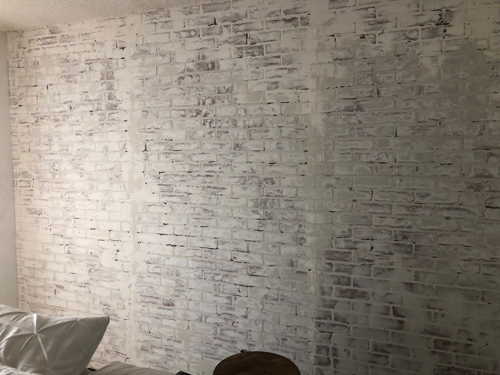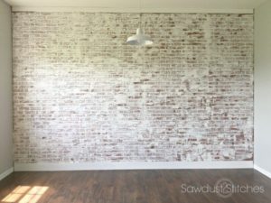 I absolutely love Sawdust 2 Stitches wall they created in their space, and wanted mine to be similar. So, I opted to go with the faux brick paneling.