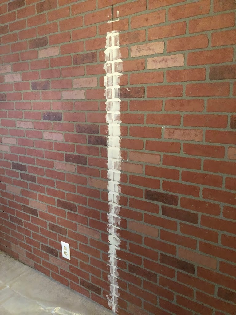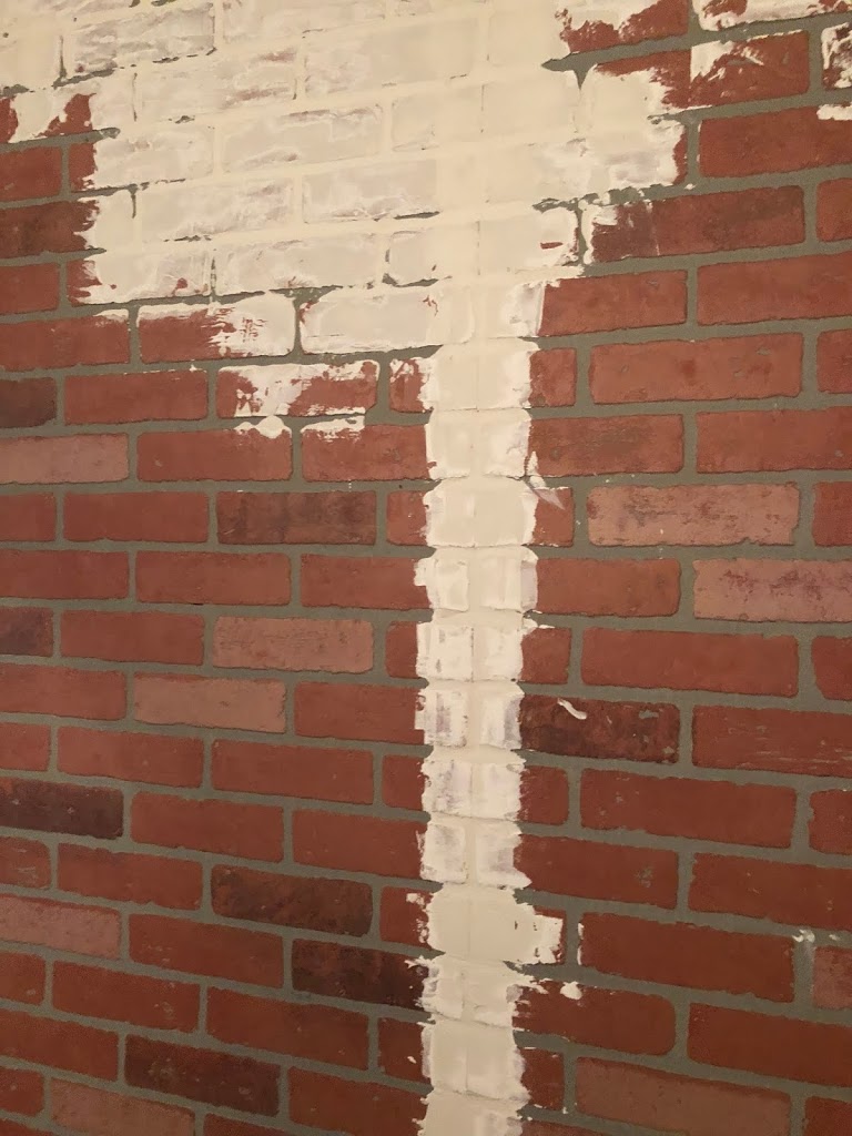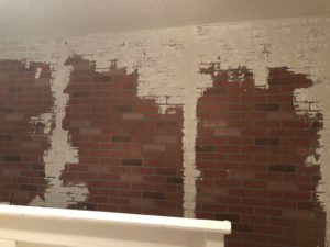 Thankfully, there was only one hole we had to jigsaw out for the outlet in the center panel. A good dose of liquid nails (found in my husband’s stash) and a few finish nails into the studs was the perfect way to attach the panels to the wall. We used the board to keep the center one in place while we positioned the other two panels trying to match up the brick rows, etc.